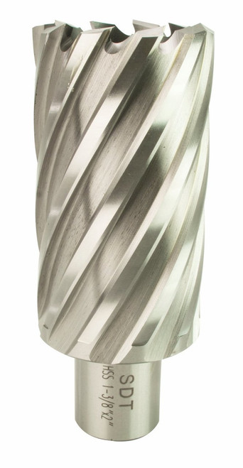 The Steel Dragon Tools 1-3/8-inch high-speed steel annular cutter. This bit will quickly and safely cut holes in steel. This bit has a 2-inch cutting depth with a 3/4 in. Weldon shank.