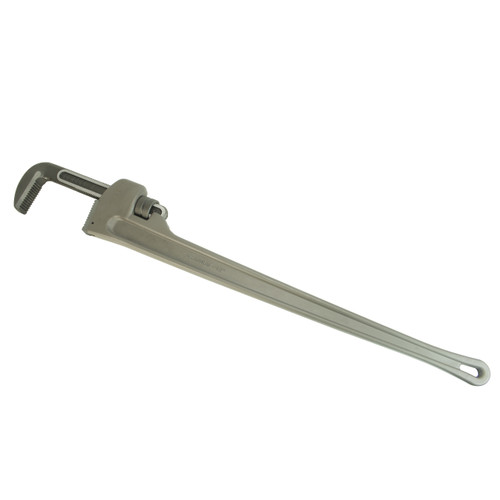 Steel Dragon Tools 48 in. Aluminum Straight Pipe Wrench 31115 features heavy-duty construction and a sturdy, aluminum I-beam frame. The I-beam frame helps keep the tool from weighing down the operator's hand without sacrificing overall durability. Aluminum construction is nearly 40% lighter than comparable cast-iron wrenches. Self-cleaning threads with replaceable heel jaw will help the wrench operating for years to come. This wrench is ideal for use on 4-inch to 5-1/2-inch pipe with a maximum 6-inch pipe capacity. Wrench features replaceable hook and heel alloy steel jaws.
