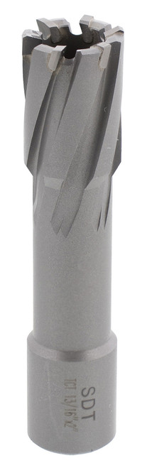 The Steel Dragon Tools 13/16-inch carbide-tipped annular cutter. This bit will quickly and safely cut holes in steel. This bit has a 2-inch cutting depth with a 3/4 in. Weldon shank.